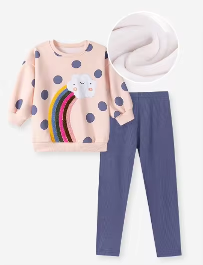 Brighten up her day with the Rainbow in a Cloud Set — where soft skies and pops of color meet! This charming outfit features a cozy sweater with fluffy cloud appliqués and a vibrant rainbow stretching across the chest, sparking joy with every wear. Paired with matching bottoms, it’s a dreamy look made for twirling and giggling.